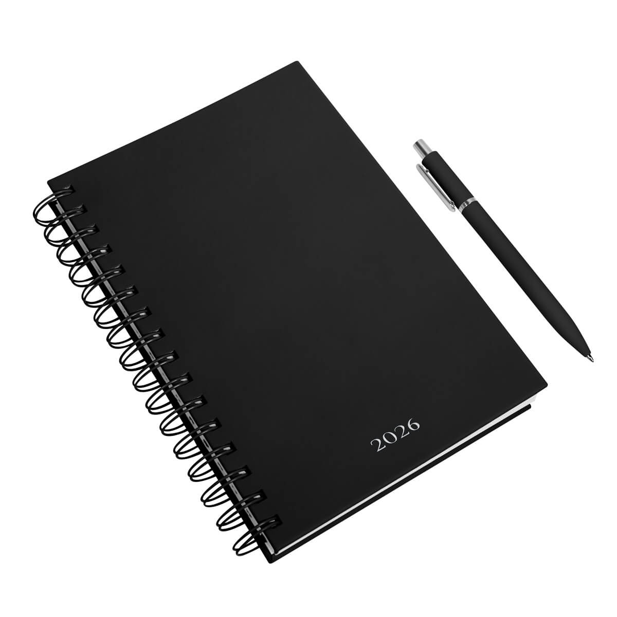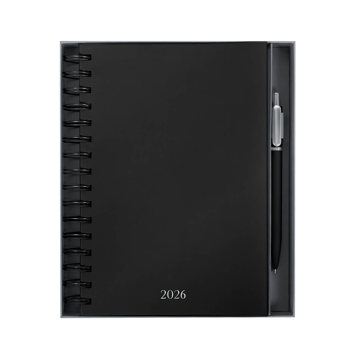 Agenda semanal con 140 hojas. Contiene datos personales, calendarios 2025-2026-2027, planeador 2026, presupuesto de gastos, seguimiento de nuevos hábitos, organizador de tareas, planeador de proyectos y días festivos. Incluye 7 secciones de separador de cartón, 3 hojas con stickers, bolígrafo metálico y caja individual tipo regalo.