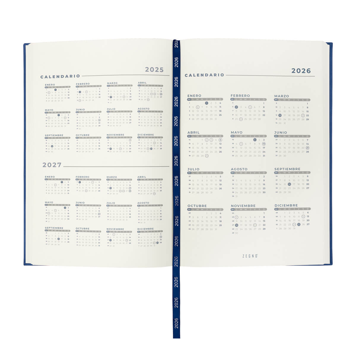 Agenda diaria con 186 hojas. Contiene datos personales, calendarios 2025-2026-2027, planeador 2026, seguimiento de nuevos hábitos, organizador de tareas, planeador de proyectos y días festivos. Incluye caja individual del mismo color a la agenda.