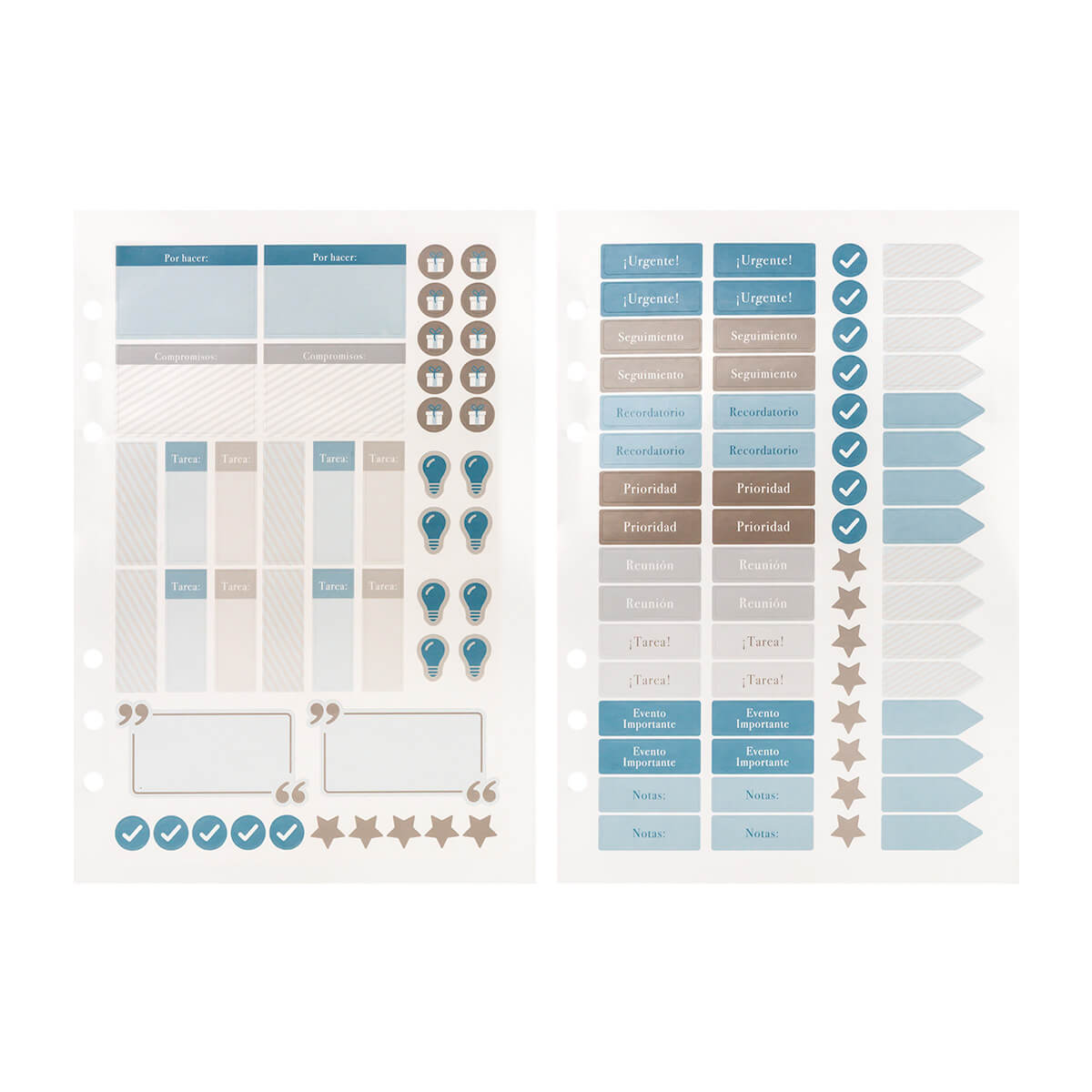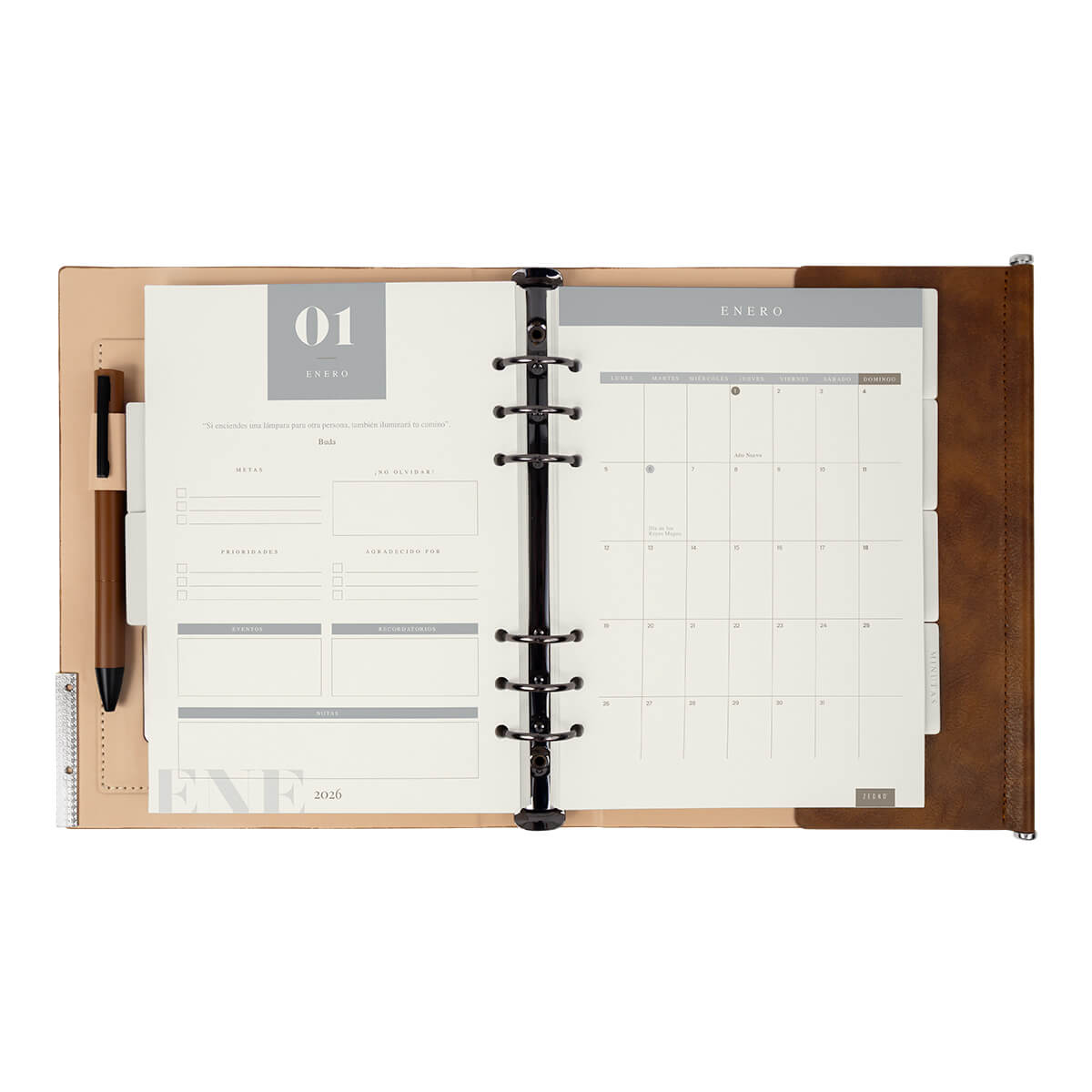Agenda semanal con 140 hojas. Contiene datos personales, calendarios 2025-2026-2027, planeador 2026, presupuesto de gastos, seguimiento de nuevos hábitos, organizador de tareas, planeador de proyectos y días festivos. Incluye 7 secciones de separador de cartón, 3 hojas con stickers, bolígrafo metálico y caja individual tipo regalo.