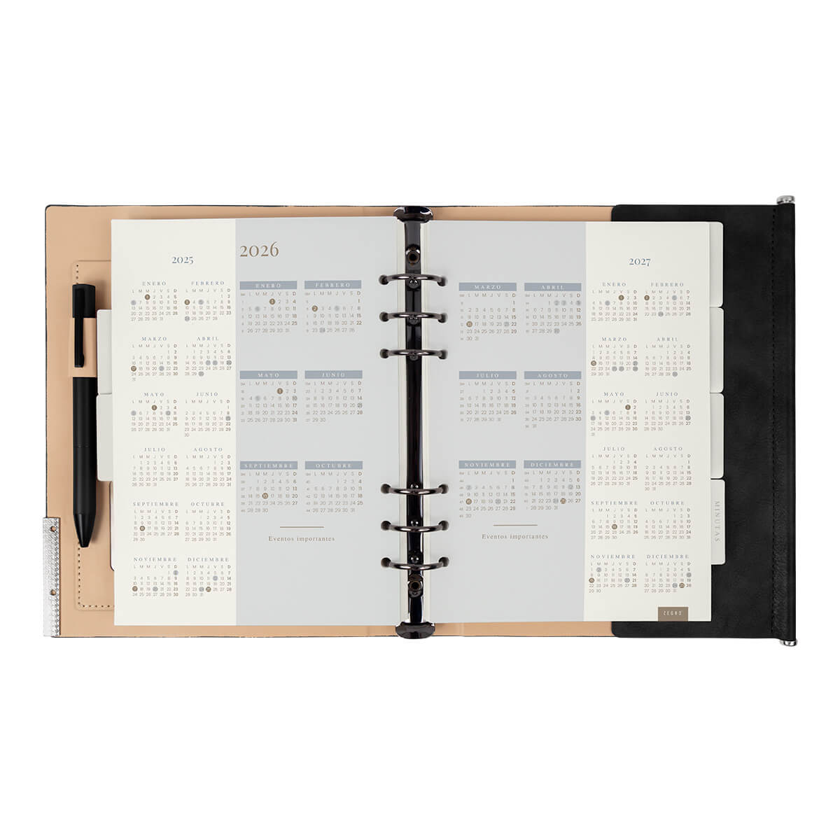 Agenda semanal con 140 hojas. Contiene datos personales, calendarios 2025-2026-2027, planeador 2026, presupuesto de gastos, seguimiento de nuevos hábitos, organizador de tareas, planeador de proyectos y días festivos. Incluye 7 secciones de separador de cartón, 3 hojas con stickers, bolígrafo metálico y caja individual tipo regalo.